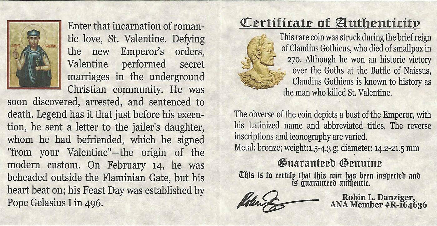 Buy Father Of Valentine Day Coin - Ancient Roman Bronze Coin Of Roman Emperor Claudius Ii Gothicus In Wood Box With Certificate Of Authenticity - Love And Death On February 14th -